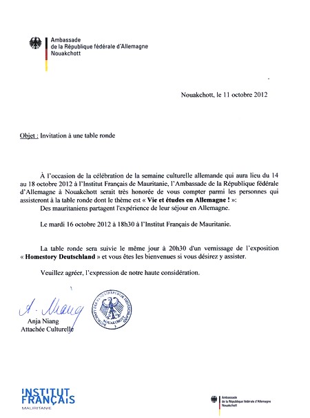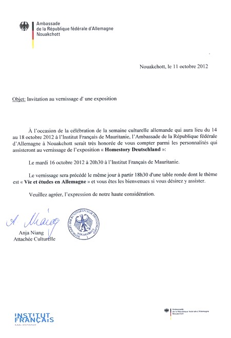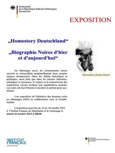 Une exposition de l'initiative des hommes noirs en Allemagne (ISD) en collaboration avec le Goethe- Institut. L'exposition aura lieu du 14 au 18 octobre 2012 à l’Institut Français de Mauritanie et le vernissage le mardi 16 octobre 2012 à 20h30.