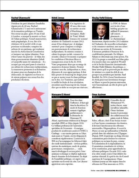 On y retrouve aussi les marocains Moulaye Hafid Elalamy, patron du groupe Sahan et ministre de l’Industrie et des Nouvelles technologies de son pays depuis octobre 2013 et Oumar Azziman conseiller du roi Mohamed VI. A coté de ces deux personnalités trônent le Burkinabé Arsène Begnossan Yé le fameux ‘’ministre de l’article 37’’ et le Congolais (Brazzaville) André Okombi Salissa qualifié de ‘’Flatteur du Macky Sall du Congo’’ par Hichem Ben Yaïche rédacteur en chef de New African.