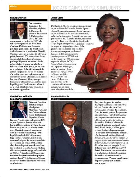 En effet, dans sa livraison N° 5 du mois de février 2014, New African, Le Magazine de l’Afrique, une des 9 publications du groupe IC Publication, présente sa sélection des ‘’100 africains influents’’. On y retrouve Claude K au milieu de personnalités comme l’Algérien Lakhdar Ibrahimi, négociateur des Nations Unies pour la Syrie, Mohammad-Mohamedou Ould Mohamedou, le plus "international" des mauritaniens et le chef du parti islamiste modéré Ennahda, Rached Ghannouchi qualifié de métronome de la transition Tunisienne.