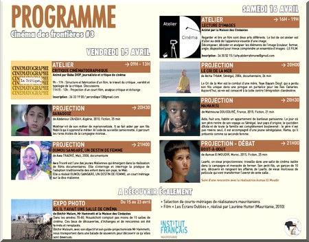 14-04-2016 05:00 - L’Institut français de Mauritanie a le plaisir de vous inviter à la 3ème édition du festival Cinémas des Frontières, vendredi 15 et samedi 16 avril