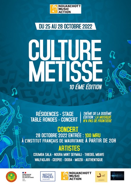 Festival Culture Métisse - L’Association Nouakchott Music Action présente les 10 ans du Festival Culture Métisse Du 25 au 28 octobre prochain à l’Institut Français de Mauritanie (IFM) se tiendra la 10e édition du FCM (Festival Culture Métisse) sous la houlette de Nouakchott Music Action(NMA) à travers le thème : Â« La musique n’a pas de frontière Â».