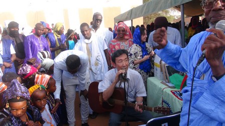 guitare à la main, entonnant des chants japonais, répétés en chœur par le public.