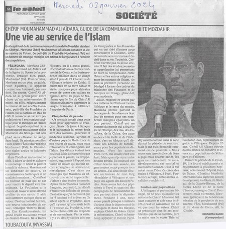Guide de la communauté musulmane chiite Mozdahir résidant à Dakar, Mawlana Chérif Mouhammad Ali Aïdara consacre sa vie au service de l'Islam. Ce petit-fils du Prophète Mouhamed (Psl) est un homme de cœur qui multiplie les actions au service de la population.