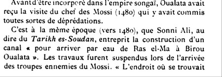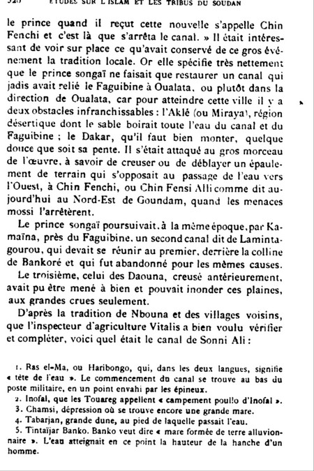 Dans cet ouvrage, il est précisé au détail, les points géographiques suivants, à travers un projet royal d’un prince de l’empire Sonrai, qui tenait à mener sa barque vacancière en hivernage, jusqu’à même Oualata ; suivant en cela, l’écoulement généré par les contreforts du Dhar de Oualata, favorisant ainsi l’émergence de lacs et de mares en piémont :