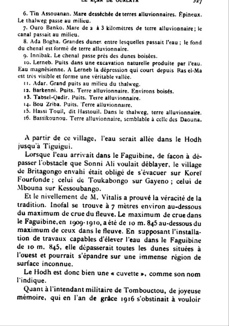 « En 1921, toute l’extension de la cuvette du lac Faguibine (affluence du fleuve Niger) jusqu’à Ras El Maa, a été identifié topographiquement par le génie militaire du Soudan français à l’époque (actuel Mali).