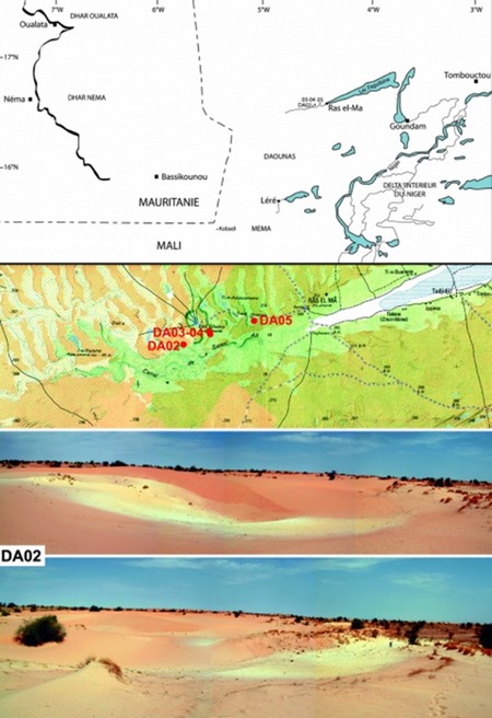 Les Tariks rapportent qu’il avait pour projet d’y aménager un cours d’eau navigable jusqu’à Oualata, afin de pouvoir intervenir rapidement, à la frontière ouest de l’empire. Cette vallée asséchée traverse un massif dunaire de sables orange vif, qui recouvrent des sables blancs fins plus anciens, occupés à l’époque protohistorique. » Figure 1 - Localisation des sites du Canal de Sonni Ali (Lac Faguibine) au Mali et agencement des sites sur sable blanc dans les niveaux inter dunaires de l’erg récent :